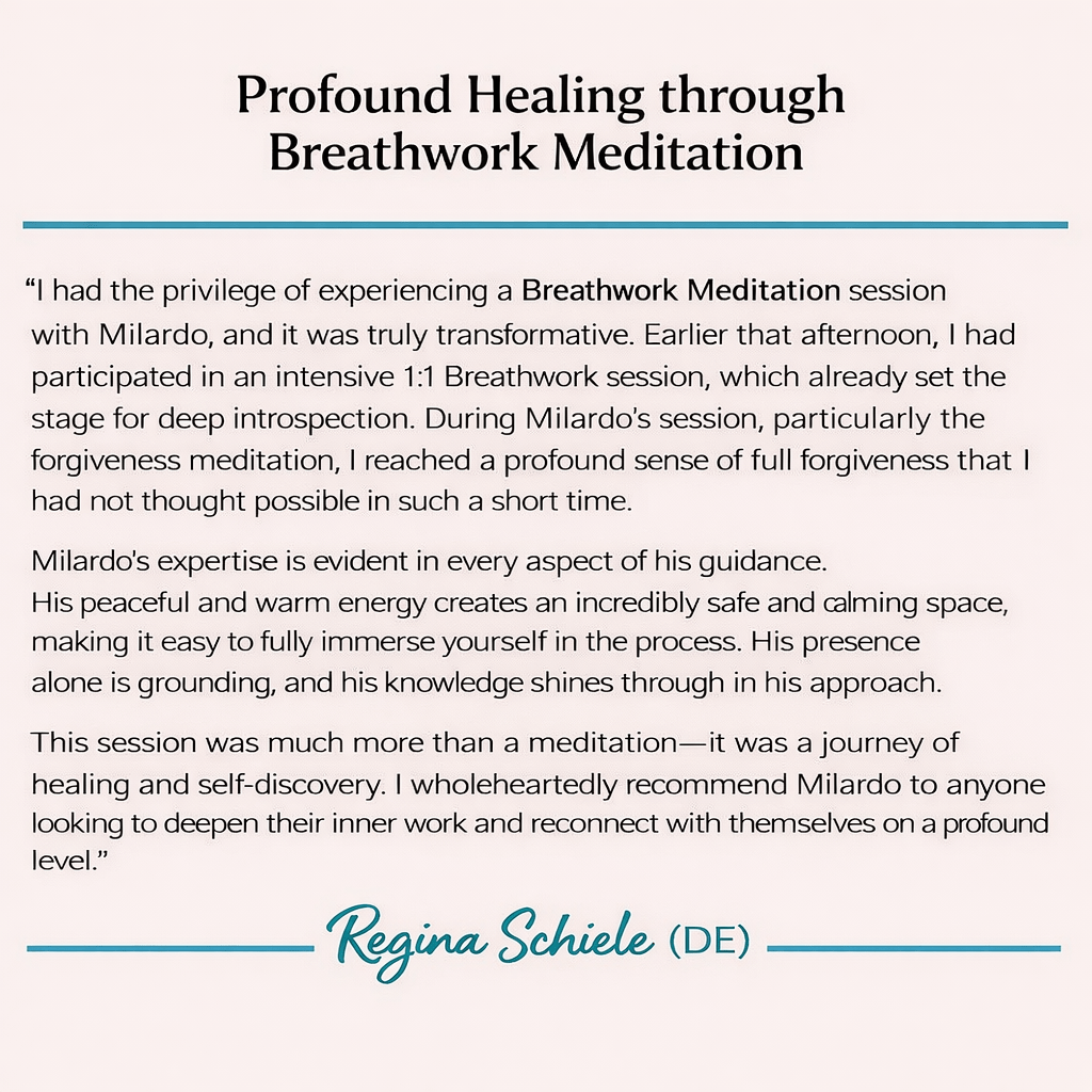 âI had the privilege of experiencing a Breathwork Meditation session with Milardo, and it was truly transformative. Earlier that afternoon, I had participated in an intensive 1:1 Breathwork session, which already set the stage for deep introspection. During Milardoâs session, particularly the forgiveness meditation, I reached a profound sense of full forgiveness that I had not thought possible in such a short time.