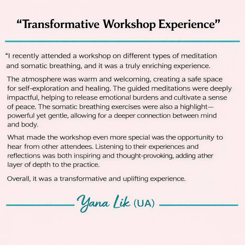 "I recently attended a workshop on different types of meditation and somatic breathing, and it was a truly enriching experience.